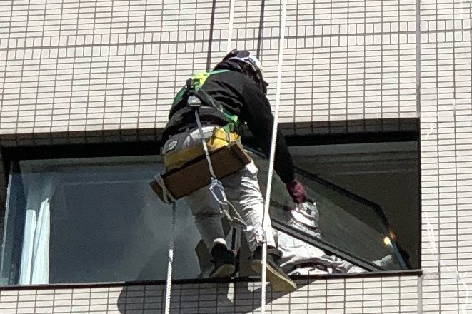 屋上から吊り下げたロープと専用の作業用具(ブランコ)を使いガラス交換工事や塗装補修などを行います。 特別危険手当支給